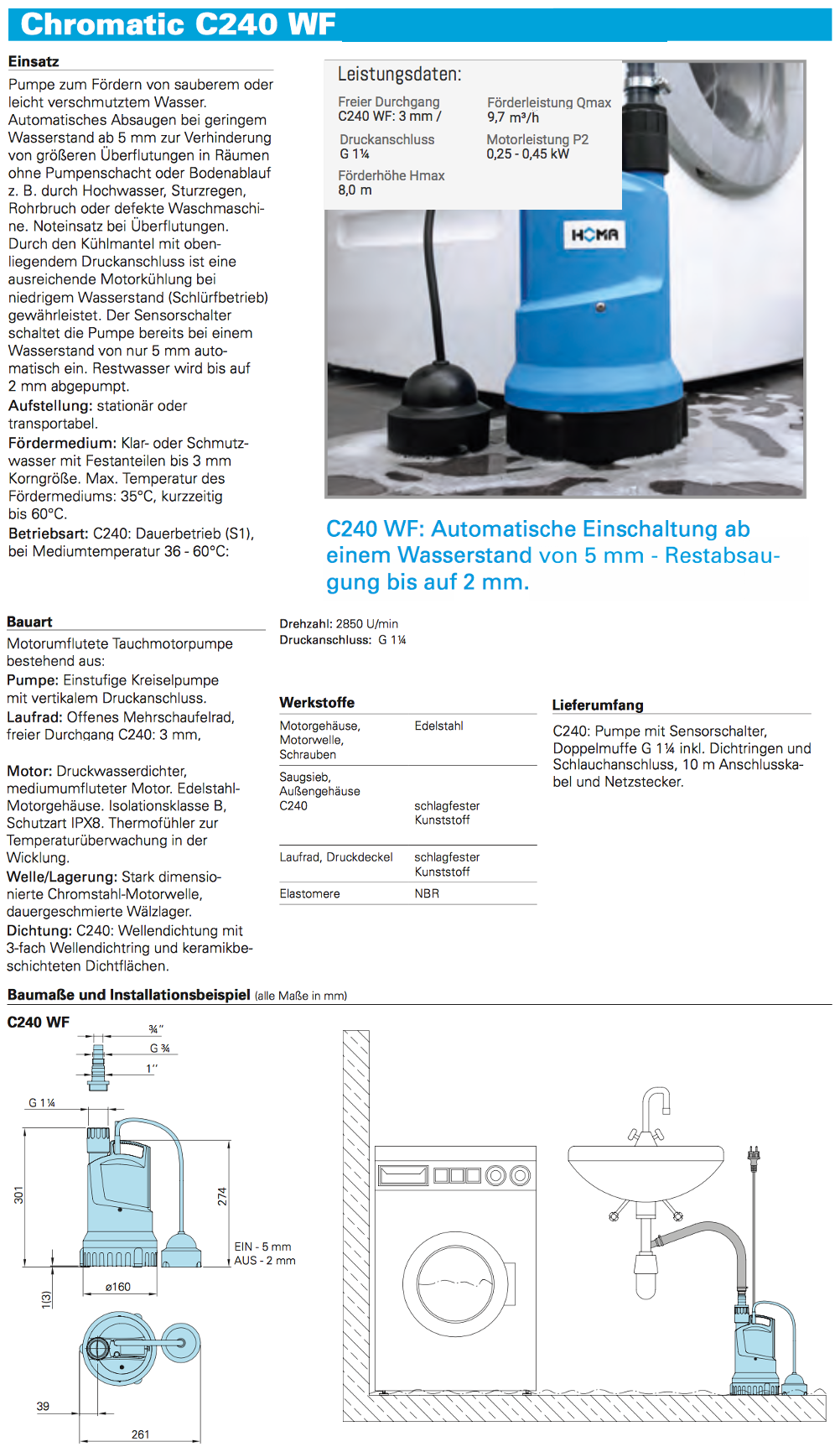 HOMA Tauchmotorpumpe Flachsauger Chromatic C 240 WF mit Sensor. Einschaltung schon ab 5 mm